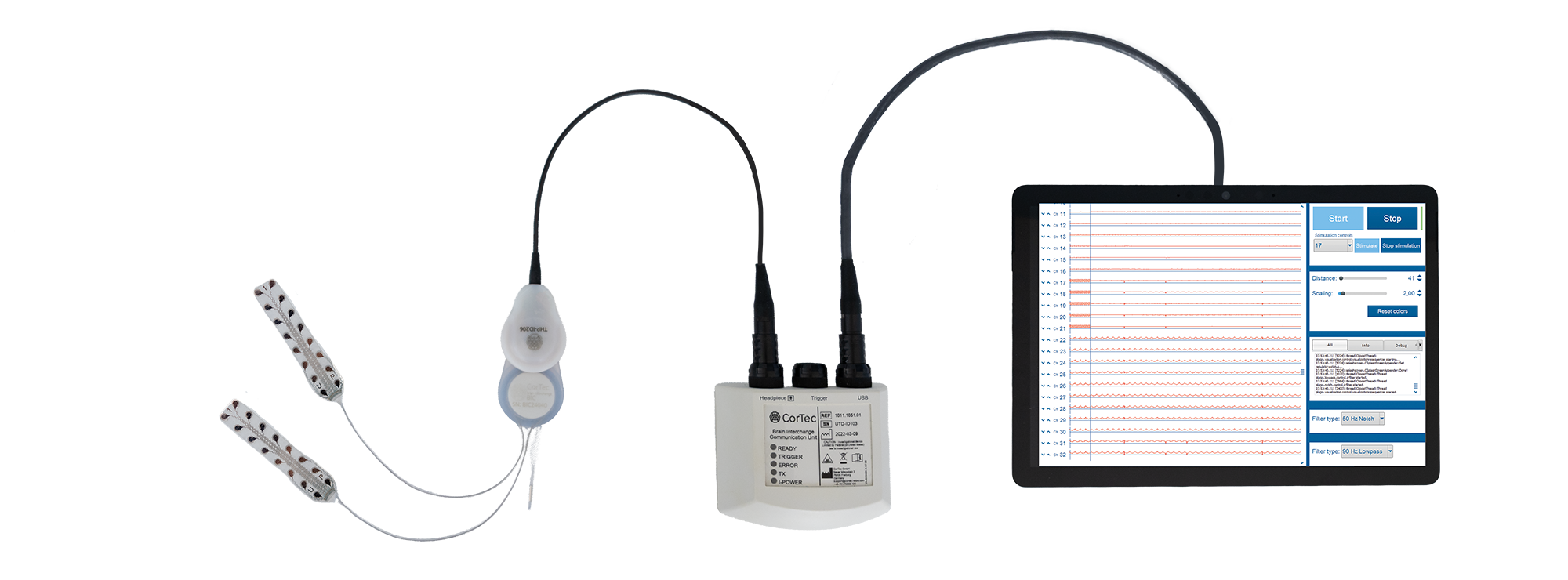 The Evaluation Kit is an electrically identical version of Brain Interchange that allows research teams to prototype therapy code, validate recording / stimulation performance, and de-risk system integration before BCI implantation.